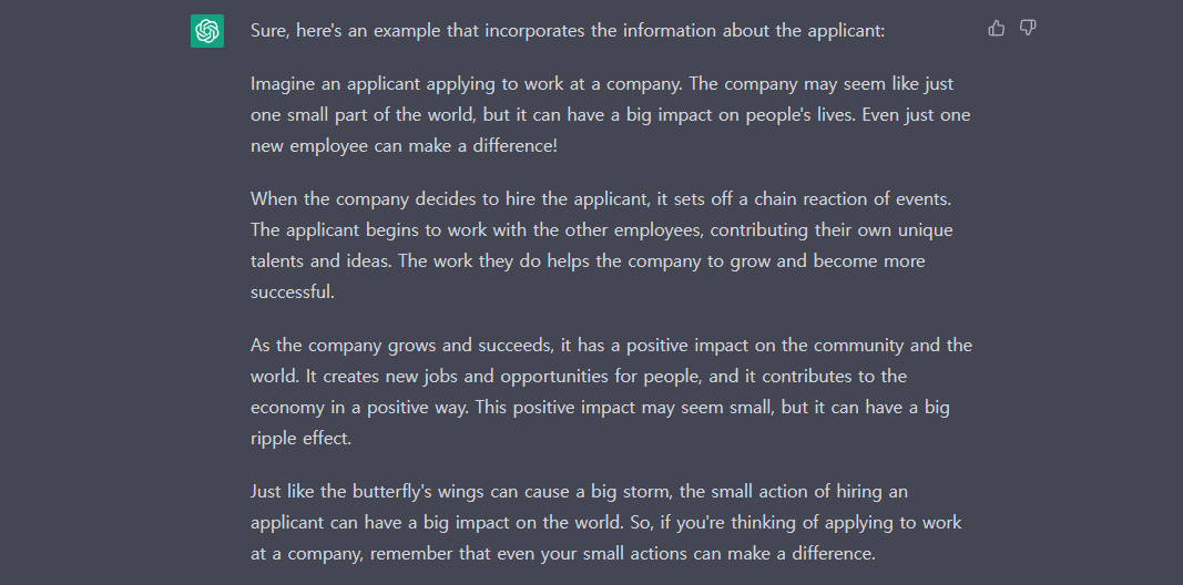 나비의 날개가 큰 폭풍을 일으킬 수 있듯이 지원자를 채용하는 작은 행동이 세상에 큰 영향을 미칠 수 있습니다. 따라서 삼성이 저를 채용하게 한다면 작은 행동이 큰 변화를 가져오듯 이러한 변화를 경험하게 될 것이라고 확신합니다.