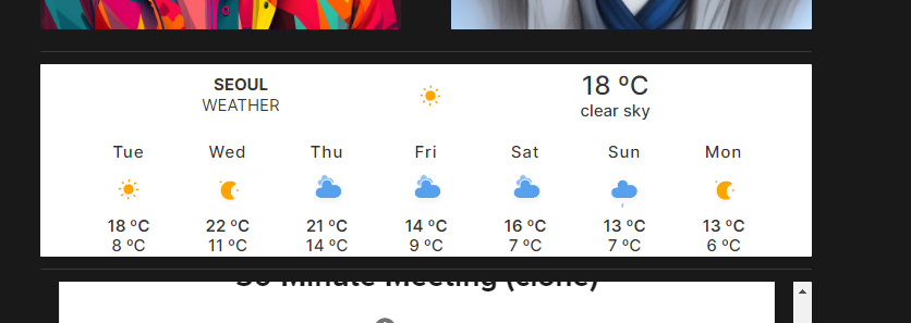 인디파이로 명언이나 카운트등을 넣을 수 있는 윗젯입니다. 필자의 홈페이지에는 주간 날씨와 시간을 넣어 놓았습니다. 아래에 스크랜캡쳐 파일이 있습니다. 사용방법은 아래 링크를 클릭하여 로그인하시면 바로 사용할 수 있습니다. 위젯을 선택한 후 원하는 홈페이지나 블로그, 노션에 들어가는 형태로 입력하면 됩니다. 입력시 지역, 단위, 보여줄 일자, 지역을 추가하시면 됩니다. 임베드 생성후 원하는 워젯을 해당 페이지에 넣을 수 있습니다.
