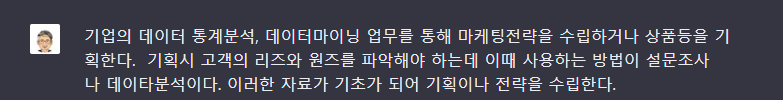 이상과 같이 인공지능에 상품의 기획, 시장분석, 기획안까지 작성하는 방법에 대해 문의했습니다. 독자여러분들의 기업이나 상황이 케이스 바이 케이스이기 때문에 디테일하게 질문할 필요가 없어 개략적인 질문만으로 대안을 찾아 보았습니다. 여러분들은 좀 더 인공지능에게 자신의 기업상황에 맞게 디테일하게 질문하여 문제를 해결해 나가시기를 바랍니다. 질문이 답입니다.