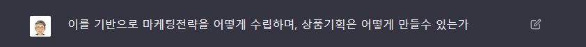 본 포스트는 인공지능 chatgpt을 통해 작성하였습니다. 기업의 마케팅전략이나 상품을 기획하기 위해 어떻게 해야 할지에 대해 인공지능에게 질문하여 문제상활을 파악하여 구체적인 전략을 세우기 위한 방안을 찾기 위해 접근하였습니다. 인공지능의 답변은 명조체로 작성되어 있습니다.