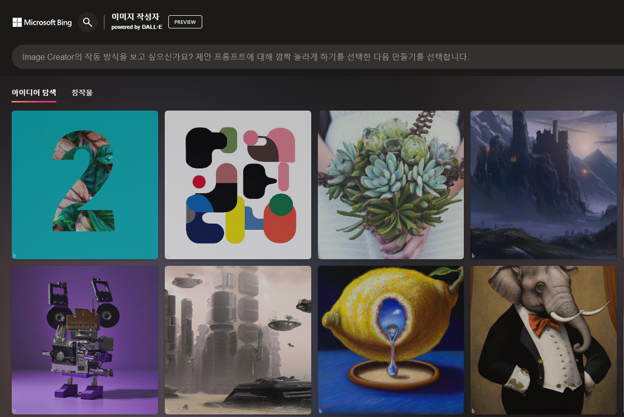 이미지를 만든 후 우측에 보면 지금까지 생성한 이미지가 나타나며, 클릭하면 원하는 이미지를 다운로드 받을 수 있다. 다른 사람들이 제작한 이미지를 보고자 한다면 좌측 상단밑에 아이디어탐색을 누르면 된다.