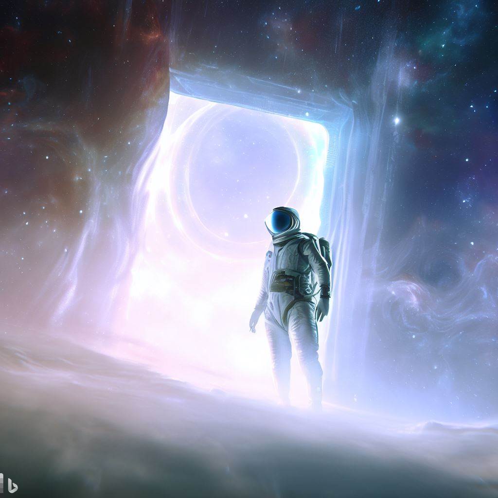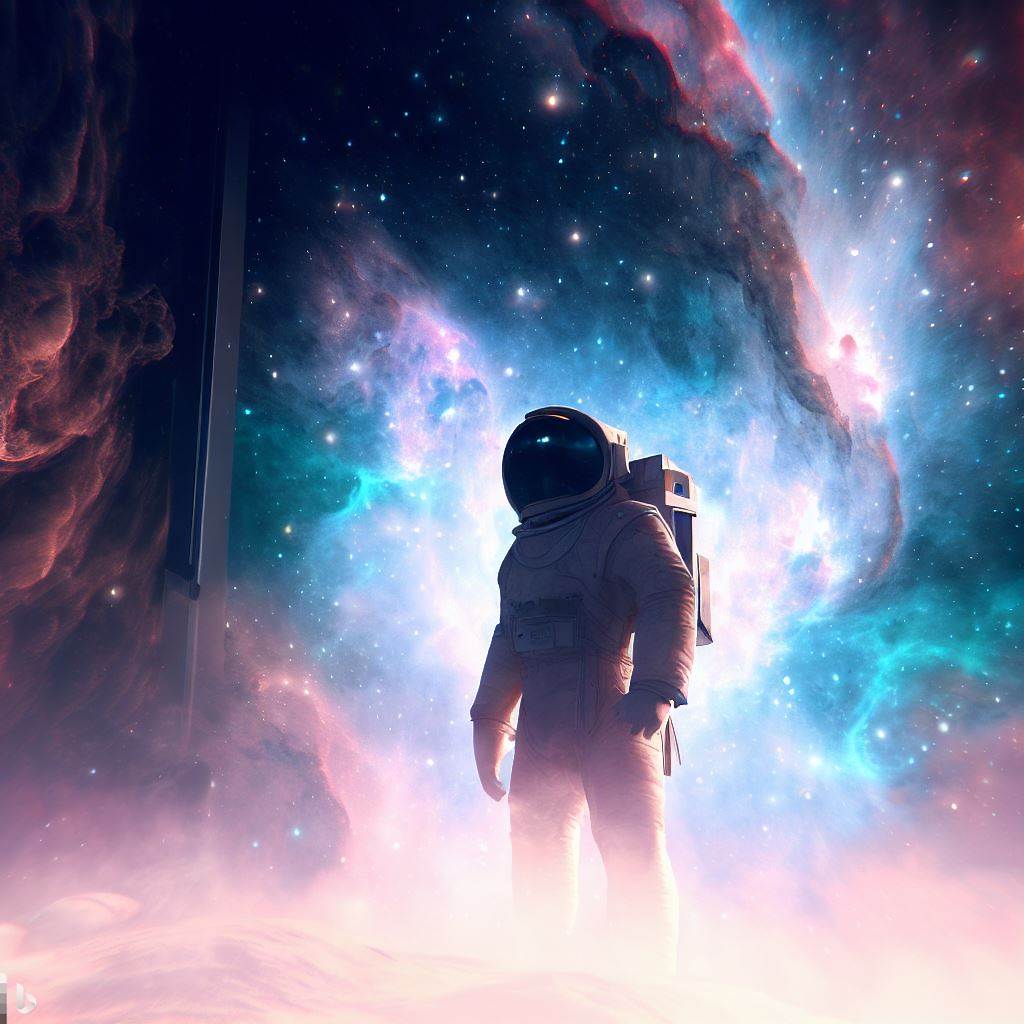 키워드 : Astronaut at misty galactic portal, in space nebula, 4k digital art
