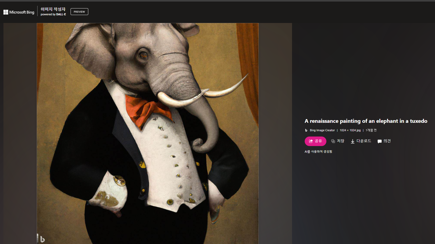 4개의 이미지가 생성되었다. 관심이 있는 이미지를 다운로드후에 사용할 수 있으며 공유를 눌러 페이스북이나 트위터등에 보낼 수 도 있다.