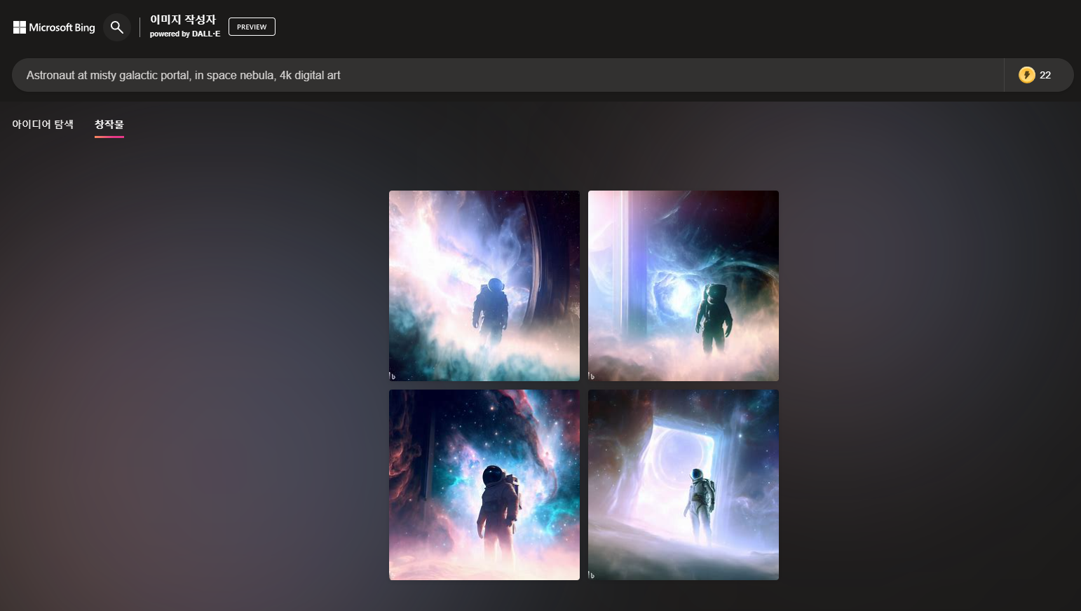 마이크로 소프트사에서 제공하는 빙이미지로 멋진 그림을 그릴 수 있습니다. 엣지 프로그램을 통해 사용할 수 있습니다. 로그인 후 사용해 보세요. 빙 이미지 크레에이터는 빙 데스크톱, 모바일 사용자가 프리뷰 또는 전용 사이트를 통해 사용할 수 있으며, 엣지를 통해 접근해야 한다. 단점은 현재 영어만 지원된다.