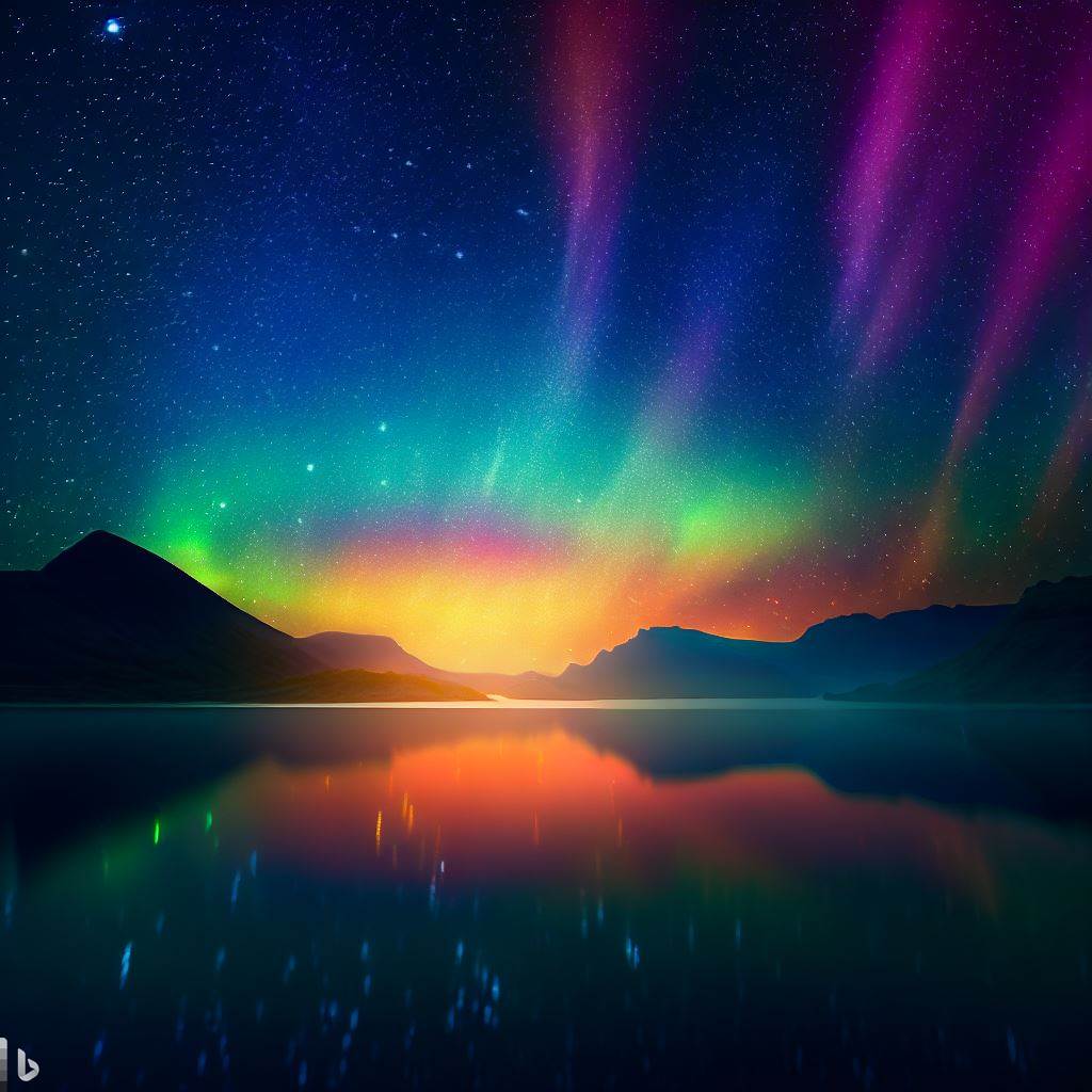 아래의 이미지는 동일한 방식으로 이미지를 생성하였다. 밤하늘에 오로라가 있고 빛들이 반짝이며, 산과 호수가 있는데 호수에 오로라가 비취는 모습을 그려달라고 해서 만든 이미지이다.