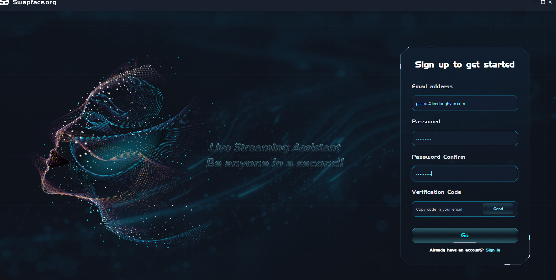 회원가입을 해야 합니다. 이메일과 비번을 넣고 아래의 코드값을 누르시면 됩니다. send를 누르시면 해당 이메일 주소로 관련 메일이 날아옵니다. 그 값을 send 아이콘앞에 넣고 아래에 go를 누르시면 됩니다.