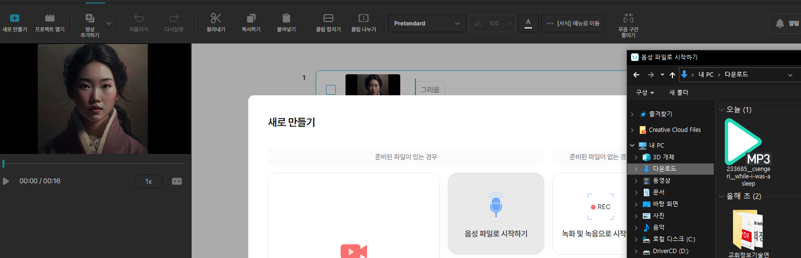 브루에서 새로만들기를 누른 후 음성파일로 시작하기를 누릅니다. 그러면 다운받은 폴더에서 해당 파일을 선택하세요.
