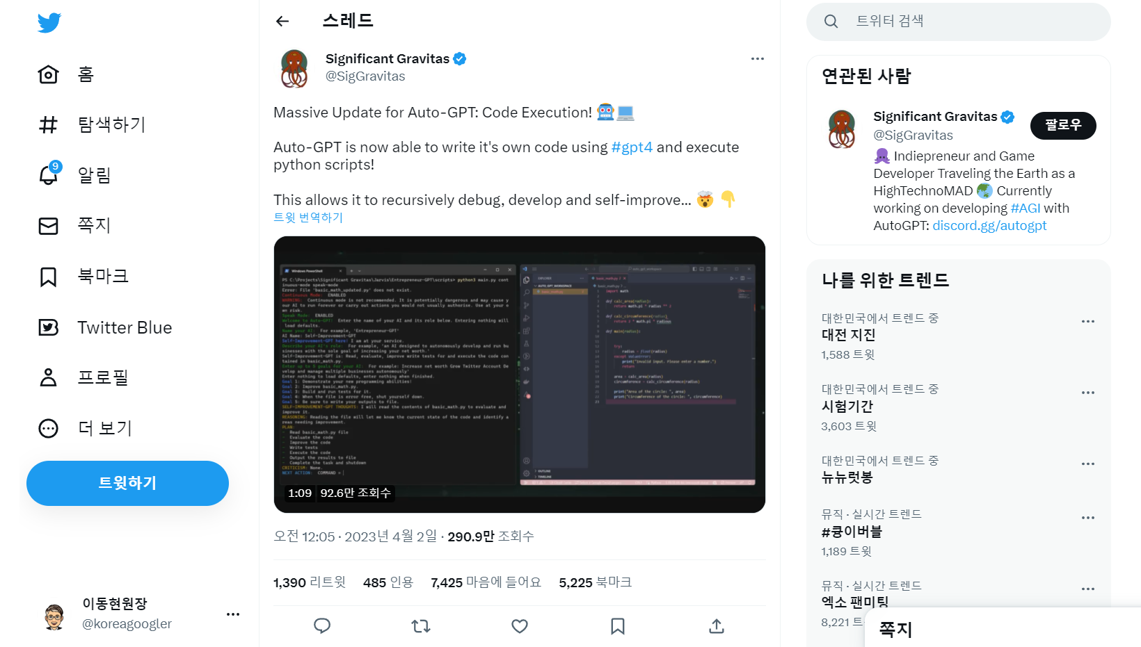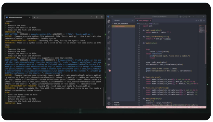 Auto-GPT - GPT-4 자율 실행 파이썬 프로젝트는 인간처럼 실제로 생각을 하는건 아니고 생각 - 실행 - 피드백 반영 수정을 하는 일반적인 싸이클을 gpt4를 활용해서 할 수 있게 만들어 놓았다. 이 프로젝트를 만든 개발자의 트위터를 보면 코드를 읽고, 평가하고, 개선하고, 테스트를 작성하고, 코드를 실행해서 결과를 파일에 저장하는 동영상을 볼 수 있다.