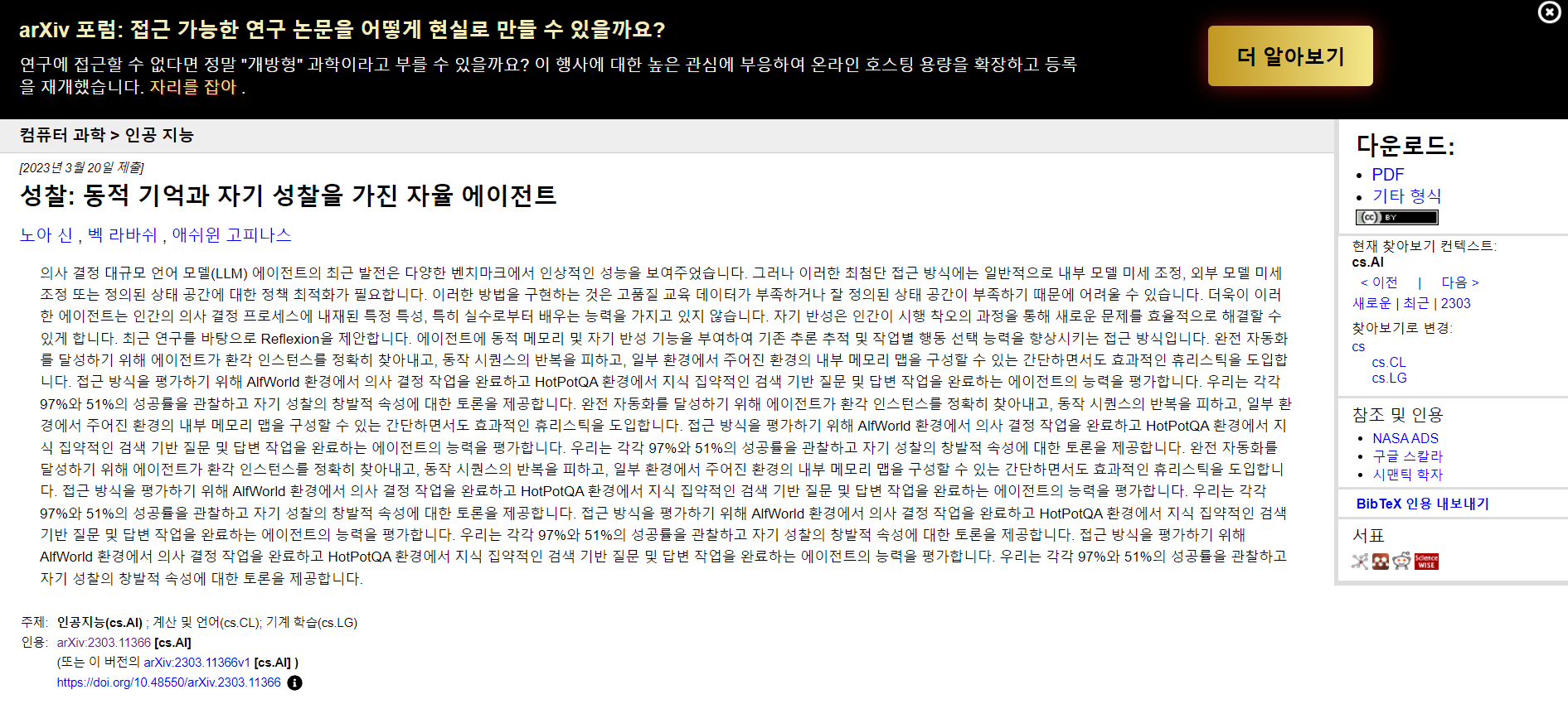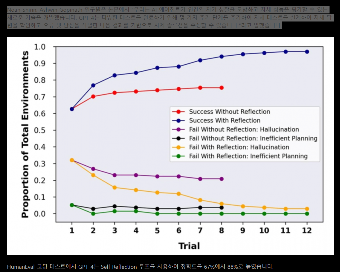 Reflexion은 AI 프레임워크 개념으로. 인공지능이 인간처럼 자기 반성 (self-reflection) 을 하듯 실행하고 체크한 후 실수에 의한 배움으로 향상을 된다는 개념이다. 인간이 pdca를 통해 문제해결을 하는 것과 동일하다. pdca는 계획하고 행동하며, 체크하고 실행한다는 개념으로 빅데이터에서 자료를 분석한 후 이를 기반으로 계획하고, 무엇을 해야 할지르 스스로 판단한 후 행동한 후 잘못된 과정이 있다면 다시 계획단계로 이동하는 단계로 보내는데 이 단계를 진행하는 것을 실행단계라고 하며 이러한 과정을 통해 문제를 해결해 나가듯 인공지능이 이러한 기능이 챗gpt와 허깅GPT을 통해 30% 향상되었다는 점에 주목할 필요가 있다. 만약 이 기능이 10%가 된다면 세상은 어떻게 변화할 지 상상이 가지 않을 정도이다. 아래는 인공지능이 동적기억을 통해 자기성찰을 할 수 있나는 내용이다.