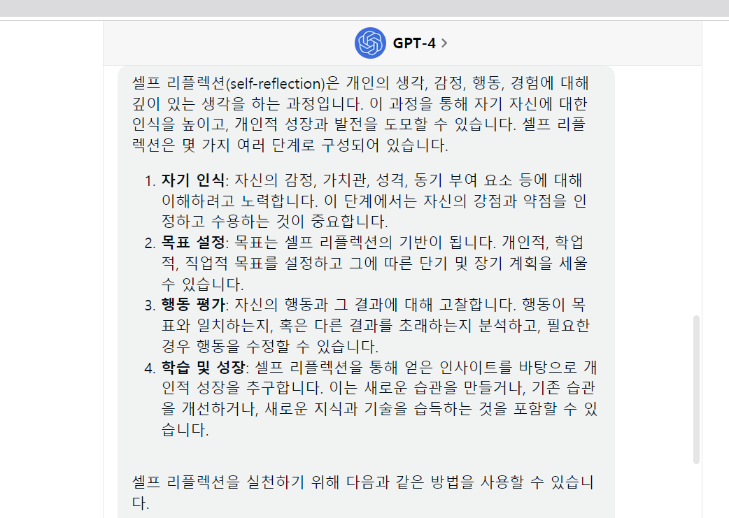 이와 관련하여 인공지능 chat gpt에게 물었다. 셀프 리플렉션에 대해서 말이다. 아래는 인공지능의 답변이다.