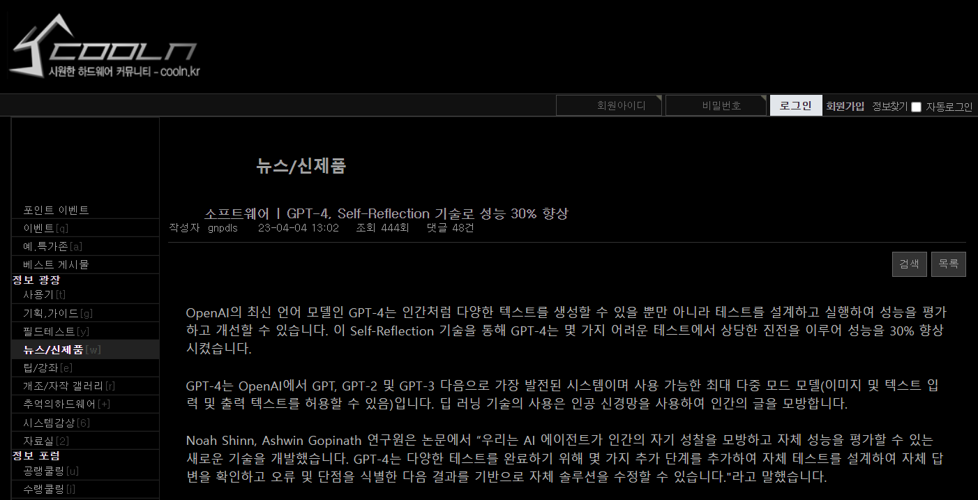 chat-4 셀플렉스(Reflexion)를 통해 인간의 성찰 기능을 하게 되었다. 인공지능 chatgpt 어디까지 발전할까? 며칠전에 인간이 인공지능과 다른 점이 있다면 생각하는 힘, 자기자신을 돌아보며, 인간답게, 나답게 살아가는 것이라고 이야기한 적이 있었다. 다시 말해 인간이 인공지능보다 나을 수 있었던 것이 바로 자기성찰 기능이었는데 인공지능이 셀프리플렉션을 동안 자기성찰기능을 할 수 있게 되었다는 점에서 놀라움과 두려움으로 찾아온다.