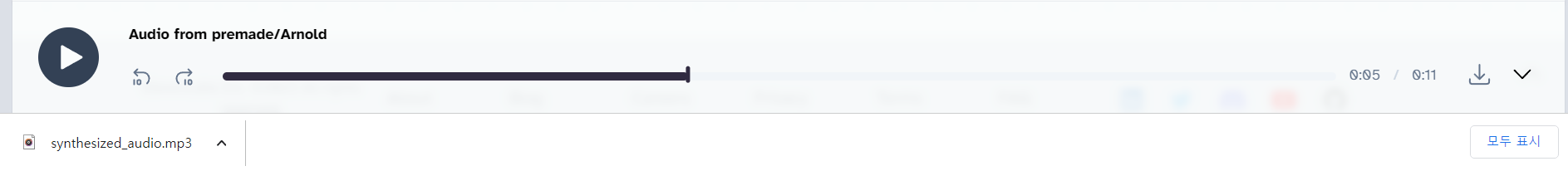 위의 있는 생성버튼을 클릭한 후 아래의 플레이 버튼을 누르면 음성파일이 생성되는데 플레이 플레이를 누른 후 음성파일이 마음에 들면 우측 하단에 있는 음성 파일을 눌러서 파일을 다운받아 사용한다.