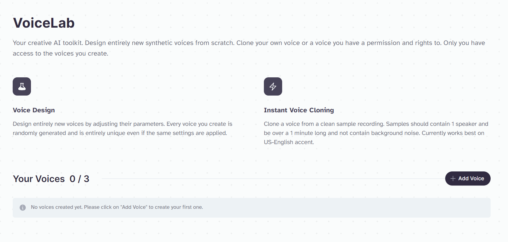 보이스 디자인을 눌러 성별과 나이, 액센트, 억양과 텍스트를 넣고 생성을 눌러서 음성을 만들거나 기본 디폴트값으로 만들 수 있습니다. 구독을 통해 자기자신의 음성을 만들수도 있다. 무료버전에서 사용후 유료로 전환하는 것을 권한다.