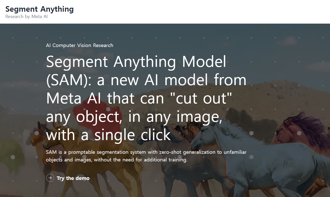 "Meta AI"라는 이미지 분할 모델회사로 이 모델은 10억개 이상의 이미지에서 학습되었으며, 이미지에서 객체를 자동으로 분리해내는 기술을 사용하고 있습니다. 이 기술은 주로 의료, 자율주행차, 보안 등 다양한 분야에서 사용됩니다. 이 모델은 일반적인 이미지 분할 기술보다 높은 정확성을 가지고 있으며, 더 적은 학습 데이터로도 높은 성능을 보이는 것이 특징입니다. 이는 기존 기술보다 빠른 개발과 더 나은 결과물을 만들어낼 수 있는 가능성을 보여주는것이 특징입니다.
