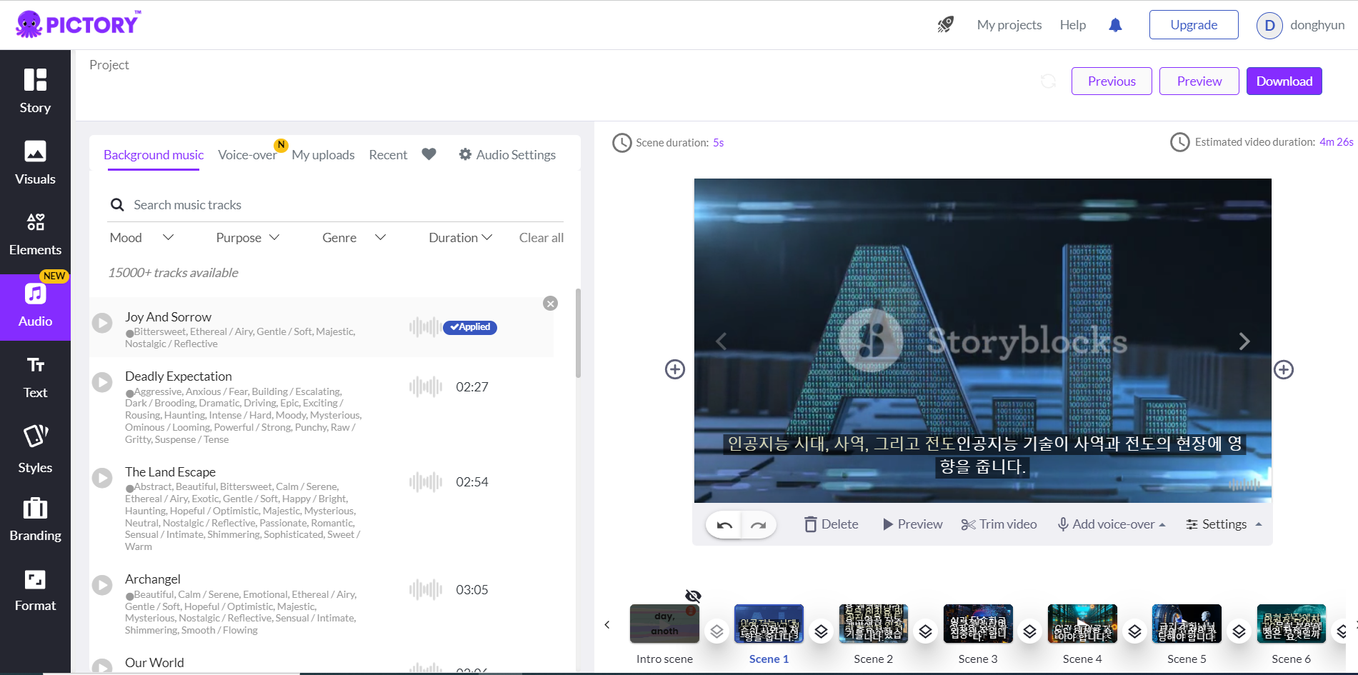 좌측메뉴에서 오디오를 선택한 후 배경음악을 선택합니다. 음원을 듣어보고 선택합니다. 음원의 분위기등을 선택할 수 있습니다.