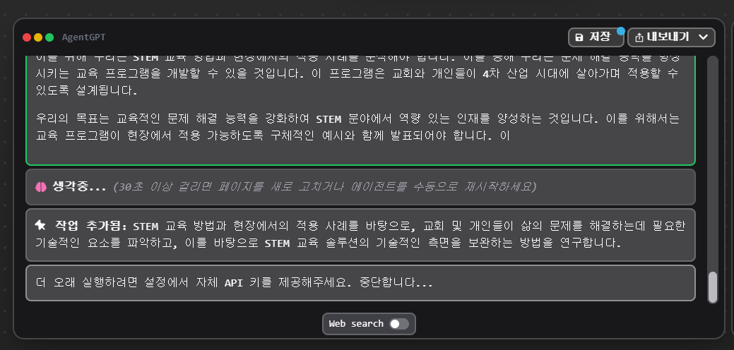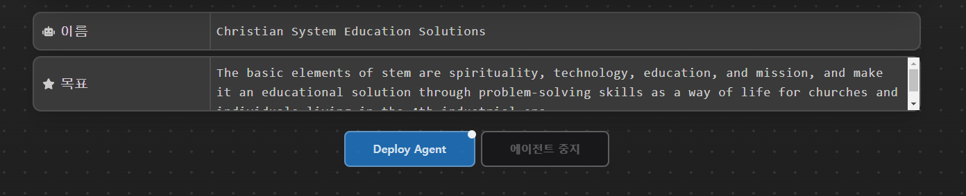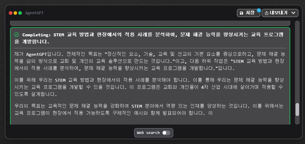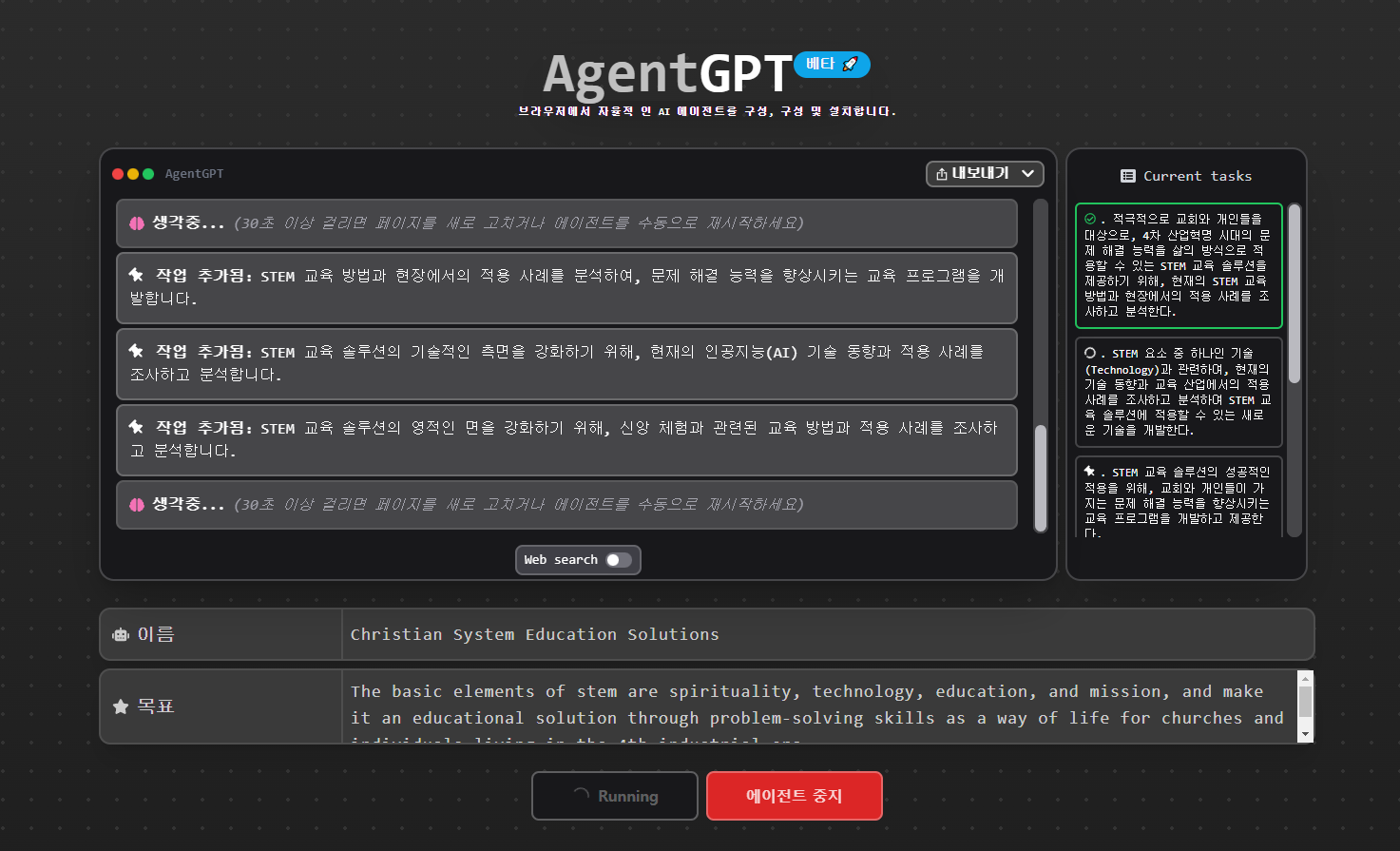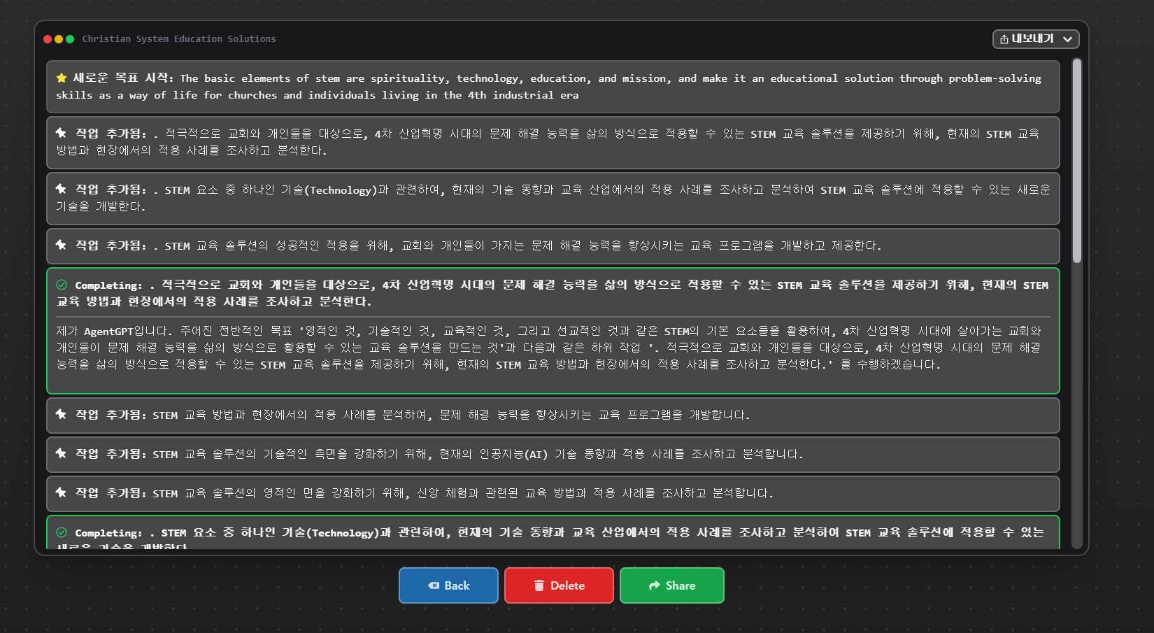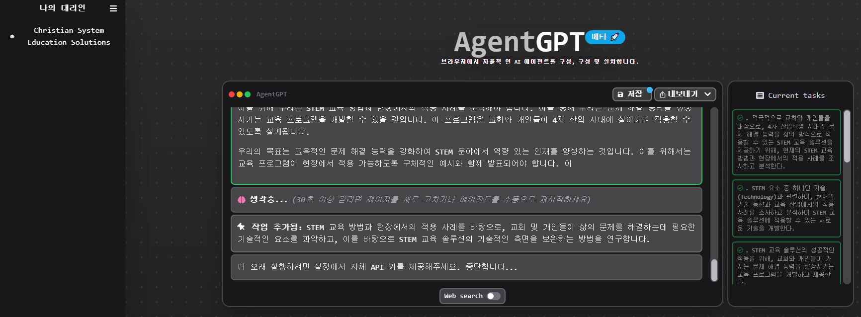 j: 에이전트GPT로서 "는 STEM의 기본 요소, 즉 영성, 기술, 교육, 선교, 그리고 4차 산업 시대에 살고 있는 교회와 개인들의 삶의 방식으로 문제 해결 능력을 통합합니다. 이 플랫폼은 대상 고객을 위한 교육 솔루션 역할을 할 것입니다.