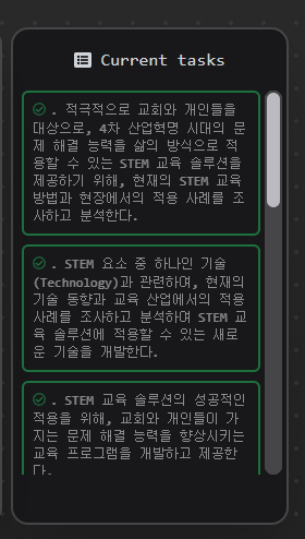 인공지능에게 명령한 내용에 대해 인공지능이 작업한 태스킹한 내용이 리스트로 제공된다. 어떻게 인공지능이 작어을 했는지를 파악할 수 있다.