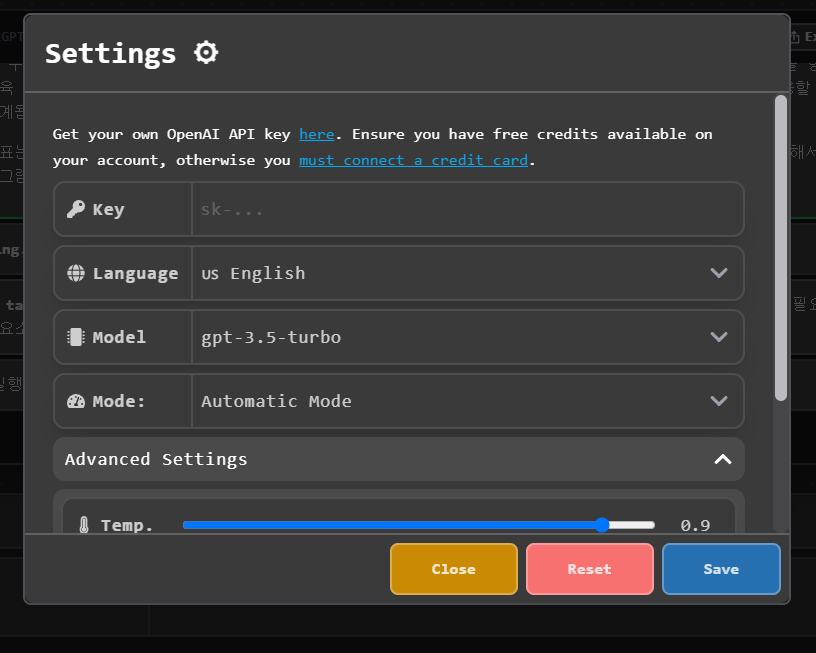 설정은 좌측 하단에 설정에서 변경할 수 있고 앞서 설명한 키값도 위에서 변경할 수 있다. 언어를 영어로 변경할 수 있다.