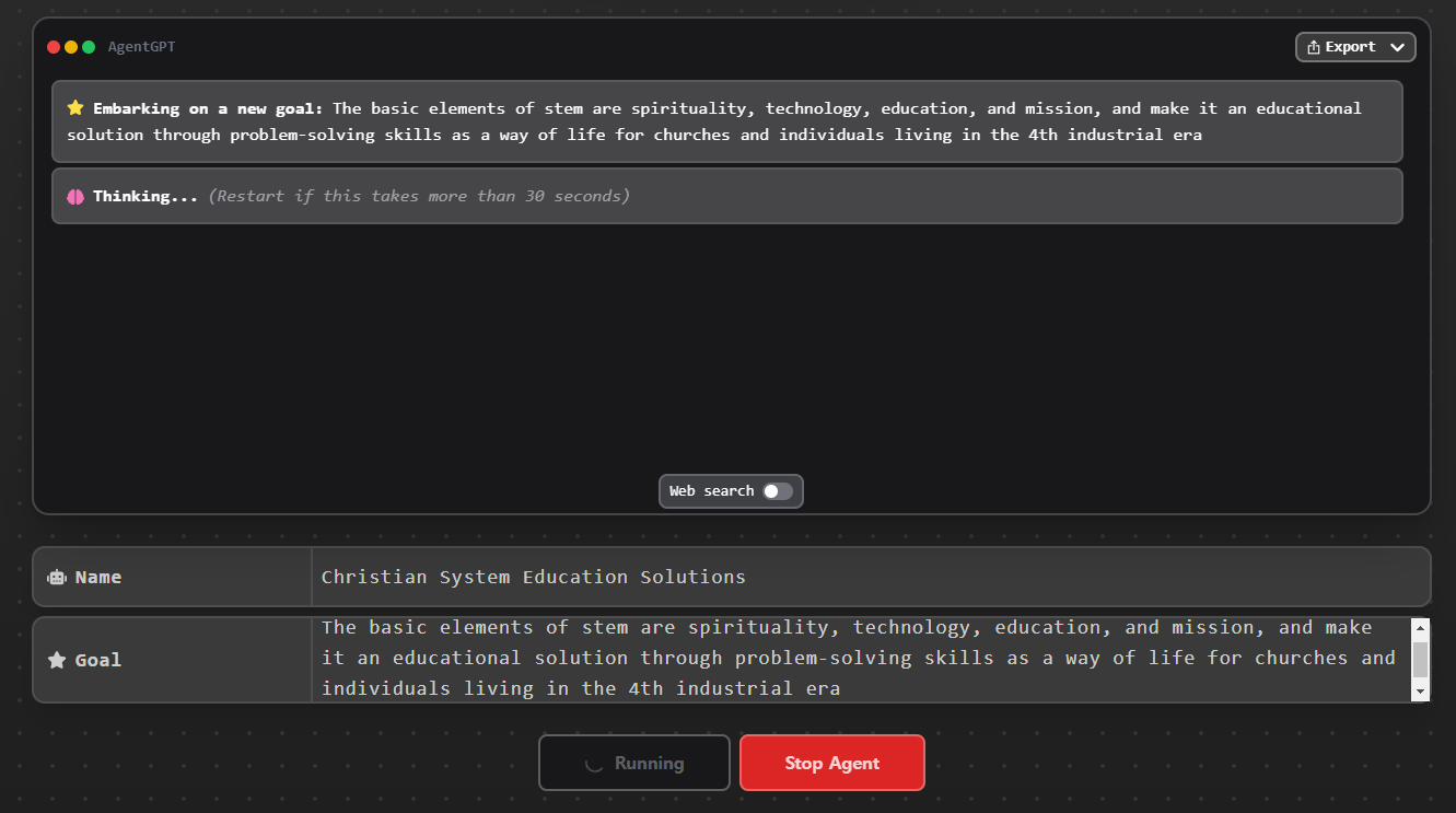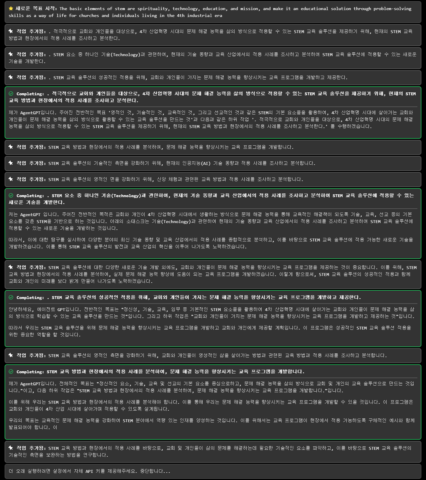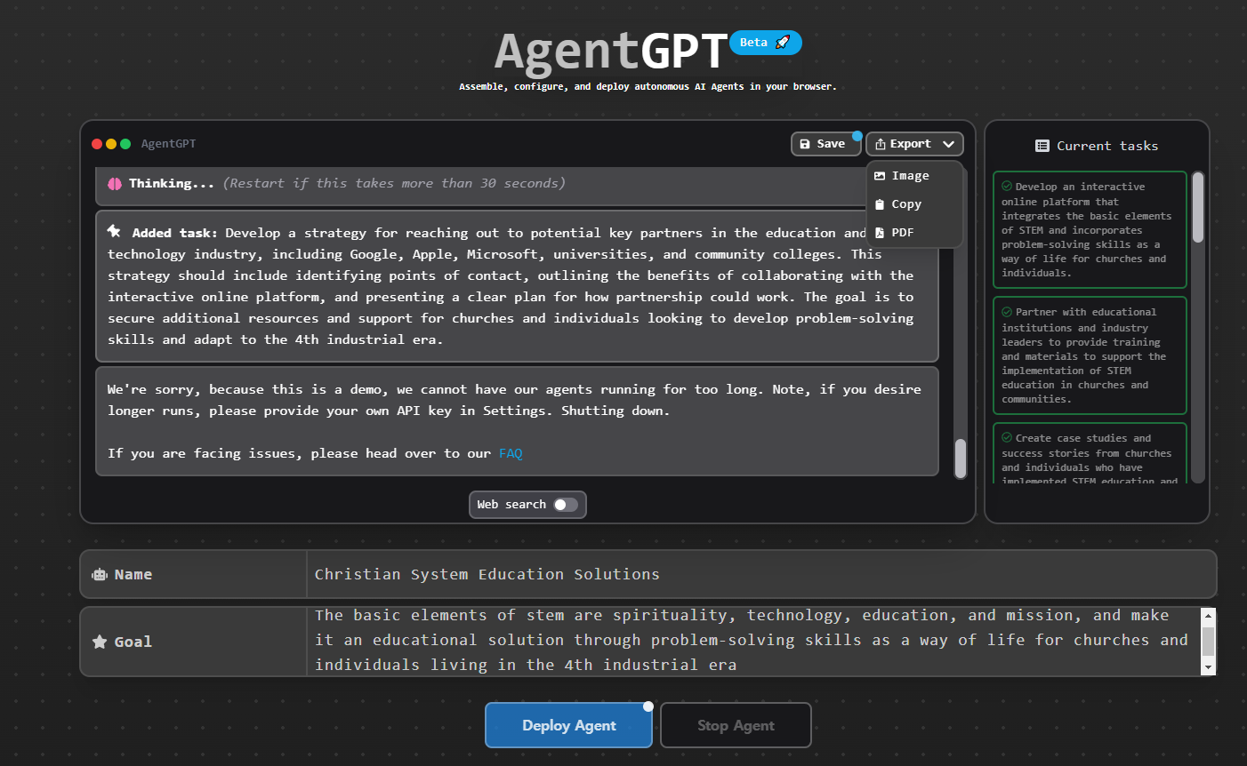 AGENT_GOAL: The basic elements of stem are spirituality, technology, education, and mission, and make it an educational solution through problem-solving skills as a way of life for churches and individuals living in the 4th industrial era Adding Task: Develop an interactive online platform that integrates the basic elements of STEM and incorporates problem-solving skills as a way of life for churches and individuals. Adding Task: Partner with educational institutions and industry leaders to provide training and materials to support the implementation of STEM education in churches and communities. Adding Task: Create case studies and success stories from churches and individuals who have implemented STEM education and problem-solving skills to showcase the beneXts and impact to society. Adding Task: Develop an interactive online platform that integrates the basic elements of STEM and incorporates problem-solving skills as a way of life for churches and individuals. EUECIT"NG jDevelop an interactive online platform that integrates the basic elements of STEM and incorporates problem-solving skills as a way of life for churches and individuals.j: As AgentGPT, " will develop an interactive online platform that integrates the basic elements of STEM, namely spirituality, technology, education, and mission, and incorporates problem-solving skills as a way of life for churches and individuals living in the 4th industrial era. This platform will serve as an educational solution for the target audience. Adding Task: "dentify potential key partners in the education and technology industry who can collaborate with the interactive online platform to provide additional resources and support for churches and individuals. Adding Task: Develop a marketing plan and outreach strategy to promote the interactive online platform and its beneXts to the target audience. Adding Task: Conduct user testing and gather feedback to continuously improve and enhance the interactive online platform. Adding Task: Partner with educational institutions and industry leaders to provide training and materials to support the implementation of STEM education in churches and communities. EUECIT"NG jPartner with educational institutions and industry leaders to provide training and materials to support the implementation of STEM education in churches and communities.j: As AgentGPT, " will partner with educational institutions and industry leaders to provide training and materials to support the implementation of STEM education in churches and communities. This will help achieve the overall obxective of making STEM an educational solution through problem-solving skills as a way of life for churches and individuals living in the 4th industrial era, with the basic elements of spirituality, technology, education, and mission. Adding Task: "dentify potential churches and communities that could beneXt from implementing STEM education and problem-solving skills, and create targeted outreach campaigns to introduce the interactive online platform and its beneXts to those speciXc groups. Adding Task: Create case studies and success stories from churches and individuals who have implemented STEM education and problem-solving skills to showcase the beneXts and impact to society. EUECIT"NG jCreate case studies and success stories from churches and individuals who have implemented STEM education and problem-solving skills to showcase the beneXts and impact to society.j: " will create case studies and success stories from churches and individuals who have implemented STEM education and problem-solving skills to showcase the beneXts and impact to society, as part of achieving the overall obxective of making STEM an educational solution through problem-solving skills as a way of life for churches and individuals living in the 4th industrial era. Adding Task: "dentify potential funding sources and create proposals to secure funding for the development and eBpansion of the interactive online platform and its outreach efforts to churches and communities. Adding Task: "dentify potential key partners in the education and technology industry who can collaborate with the interactive online platform to provide additional resources and support for churches and individuals. EUECIT"NG j"dentify potential key partners in the education and technology industry who can collaborate with the interactive online platform to provide additional resources and support for churches and individuals.j: Wased on the overall obxective of Stem, " will identify potential key partners in the education and technology industry who can collaborate with the interactive online platform to provide additional resources and support for churches and individuals. " suggest reaching out to technology companies such as Google, Apple, and Microsoft, as well as educational institutions such as universities and community colleges. These partners can offer resources such as online courses, training programs, and access to educational materials that can help individuals and churches develop problem-solving skills and adapt to the 4th industrial era. Adding Task: Develop a strategy for reaching out to potential key partners in the education and technology industry, including Google, Apple, Microsoft, universities, and community colleges. This strategy should include identifying points of contact, outlining the beneXts of collaborating with the interactive online platform, and presenting a clear plan for how partnership could work. The goal is to secure additional resources and support for churches and individuals looking to develop problem-solving skills and adapt to the 4th industrial era. 'e3re sorry, because this is a demo, we cannot have our agents running for too long. Note, if you desire longer runs, please provide your own AP" key in Settings. Shutting down