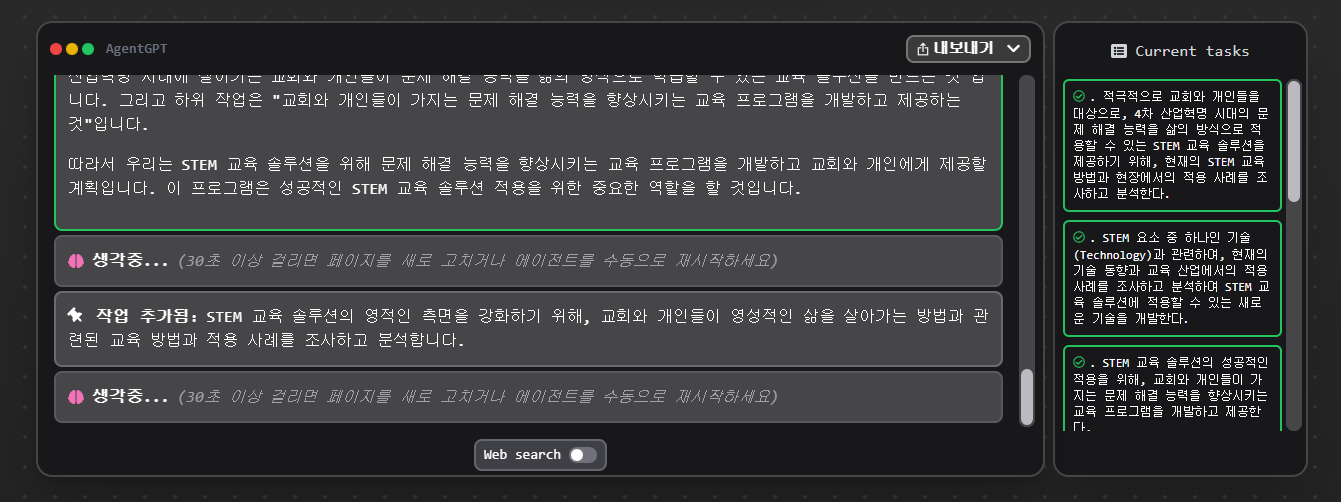 j: 에이전트GPT로서 "는 STEM의 기본 요소, 즉 영성, 기술, 교육, 선교, 그리고 4차 산업 시대에 살고 있는 교회와 개인들의 삶의 방식으로 문제 해결 능력을 통합합니다. 이 플랫폼은 대상 고객을 위한 교육 솔루션 역할을 할 것입니다.