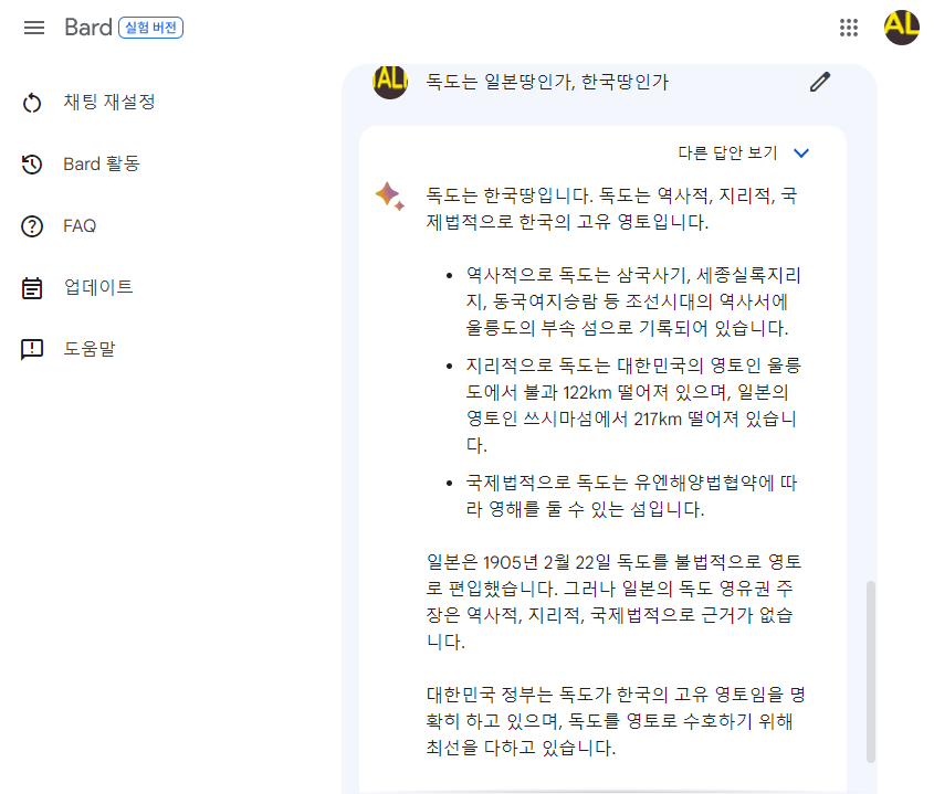 구글바드에서는 독도가 한국의 고유의 영토라고 이야기하고 있습니다. 멋진 녀석이죠.