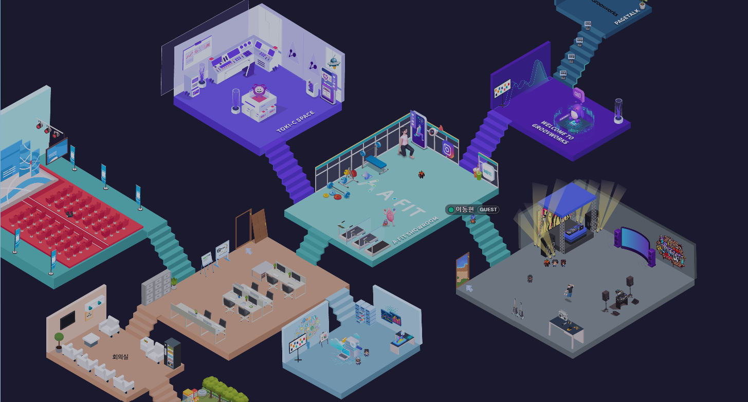 필자의 경우 게더타운을 통해 쉽고 편리하면서 빠르게 메타버스를 공간을 만들어 사용중에 있으며, 이곳에 어떻게 하면 인공지능 기술을 넣을까 고민하였습니다. 그러다가 게더타운에 ai챗봇 서비스를 제공한다는 이야기를 듣고 해당 게더타운에 들어가 보았습니다. 이 업체는 그루브웍스로 메타버스 서비스인 게더타운에 인공지능 챗봇을 적용한 비대면 커뮤니케이션 서비스였습니다. 게더타운내에 있는 npc(논플레이어 캘릭터)에 해당 인공지능 챗봇기능이 있는 고정 캐릭터를 배치, 사용자가 필요할 때 이 캐릭터와 대화를 통해 정보를 얻을 수 있게 한다는 점이다. 이 기능은 해당 업체의 페이지톡 기술을 게더타운에 적용한 듯 하다. 텍스트중심이 아닌 예약등이 가능하다.