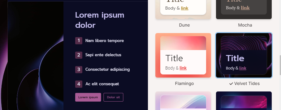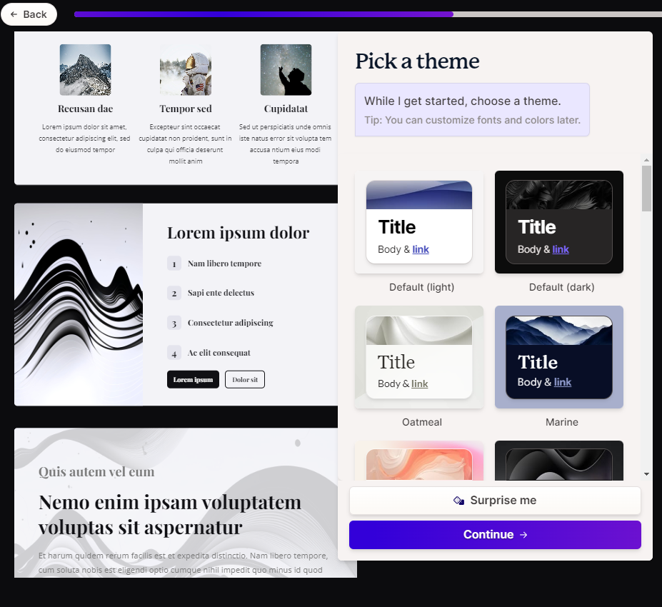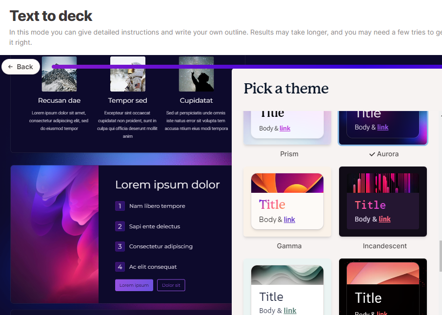 그리고 난 후 앞서 작업한 주제로 하거나 아니면 다른 주제로 할 수 있습니다 참고로 보시면 콘텐츠를 여러분들이 원하는 방식으로 제작할 수 있습니다. 텍스튼 7500자를 입력하여 원하는 입맛으로 프리젠테이션을 만들 수 있습니다. 기존의 프리젠테이션 콘텐츠나 워드문서내에서 텍스트를 가져와 작업이 가능합니다.