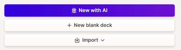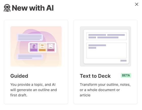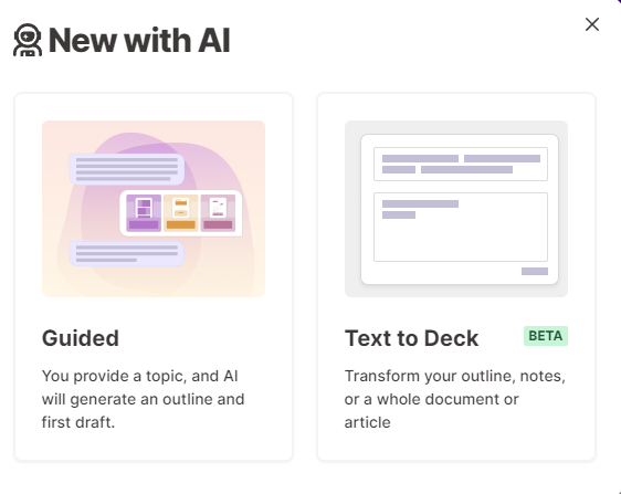 상단에 있는 인공지능으로 새로만들기를 누릅니다. 그런후 텍스트 투 데크를 눌러서 만듭니다 앞선 부분은 가이드를 눌렀다는 점과 차이가 있습니다.