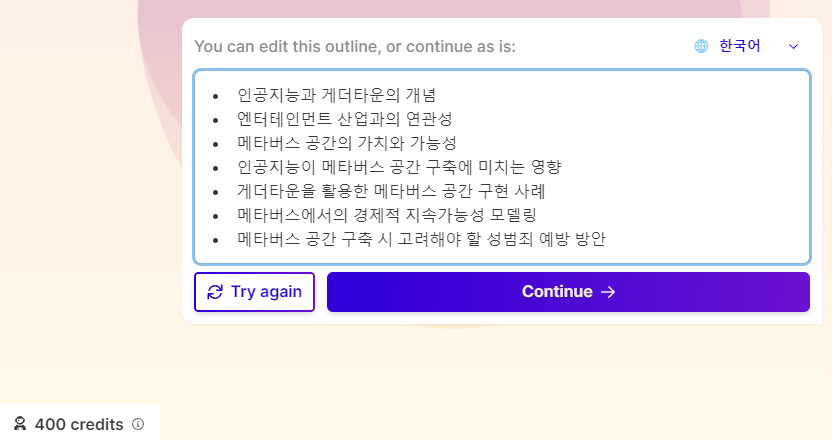 질문을 입력하였습니다. 그 결과를 보시죠. 그러면 크리딧이 나간다는 메세지가 나온 후 해당 내용이 만들어 집니다. 특별히 고칠 내용이 없는 것 같네요. 그냥 다음을 눌러서 넘어가도 됩니다.