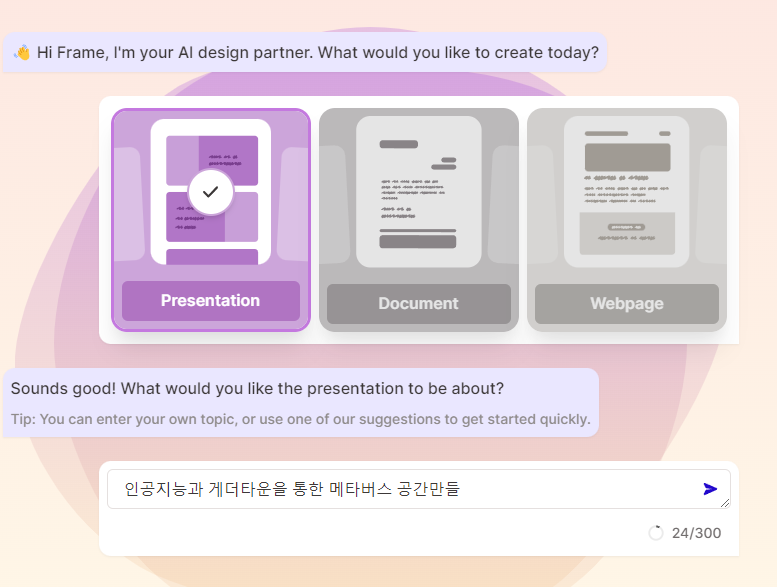 그러면 주제에 대해 입력하라고 나옵니다. 여러분들이 어떤 프리젠테이션을 만들것인지에 대해 입력하는 곳입니다. 디테일하게 입력하면 더 적합한 프리젠테이션 문서를 만들 수 있습니다. 이 때 내장된 인공지능으로 문서가 제작됩니다.