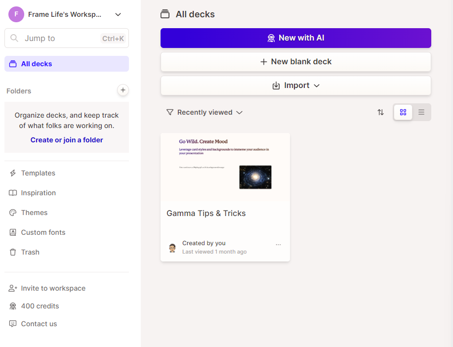 기본적으로 위와 같은 화면이 나옵니다. 하단에 보시면 기본 크리딧이 제공되는데 400크리딧으로 10개정도의 프리젠테이션 파일을 만들수 있고요. 인공지능에게 원하는 프리젠테이션 파일을 만들라고 하면 10크리딧이 이용됩니다. 탬플릿을 이용하면서 부분을 수정하면 50크리딧이 나간다고 생각하시면 됩니다. 제작된 프리젠테이션이 만족하다면 추후에 별도로 크리딧을 구매하시면 됩니다. 가장 단단한 방법은 템플릿을 이용하는 방법이지만 그렇게 하면 실력이 늘지 않겠죠 그래서 번거럽지만 수동으로 만들어 보도록 하겠습니다.