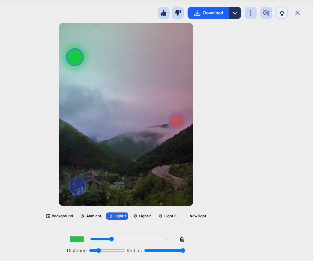 이미지 안에 녹색, 청색, 분홍(빨강)색 모양을 눌러서 색상을 변경할 수 있습니다. 물론 아래에 보시면 라이크1부터 3까지 있읍니다. 분위기를 느낌이 오는대로 변경해 보세요