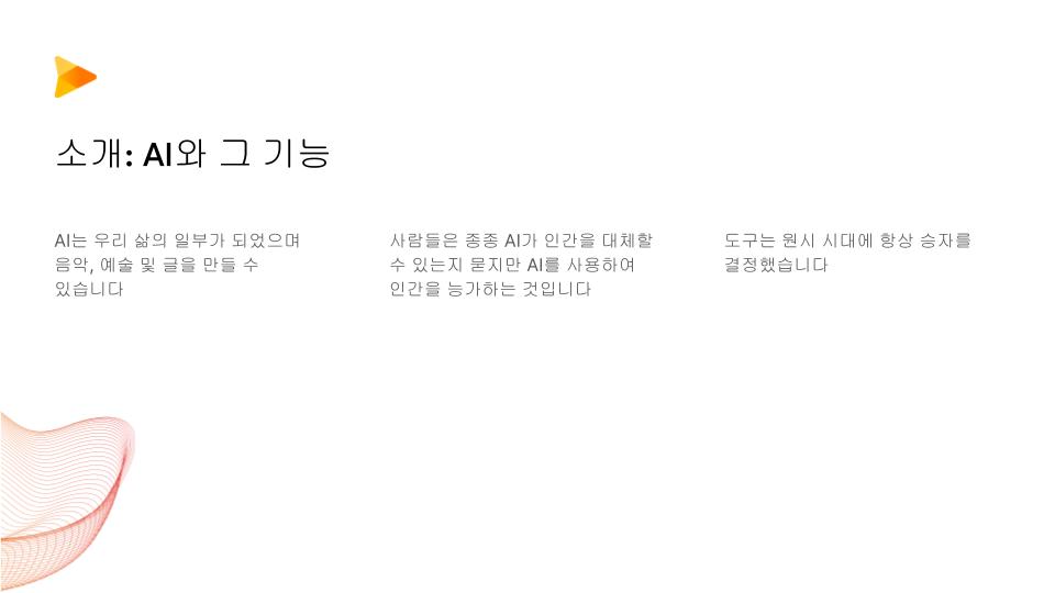 구글프리젠테이션에서 인공지능 슬라이드 기능을 추가하여 원고만 있으면 원하는 프리젠테이션 파일을 만들어 줍니다. 중요한 것은 본인의 원고내용과 구성입니다. 해당 내용부분은 패스하고 기본으로 제작된 텍스트를 기반으로 하여 프리젠테이션 파일을 만들어 보도록 하겠습니다.