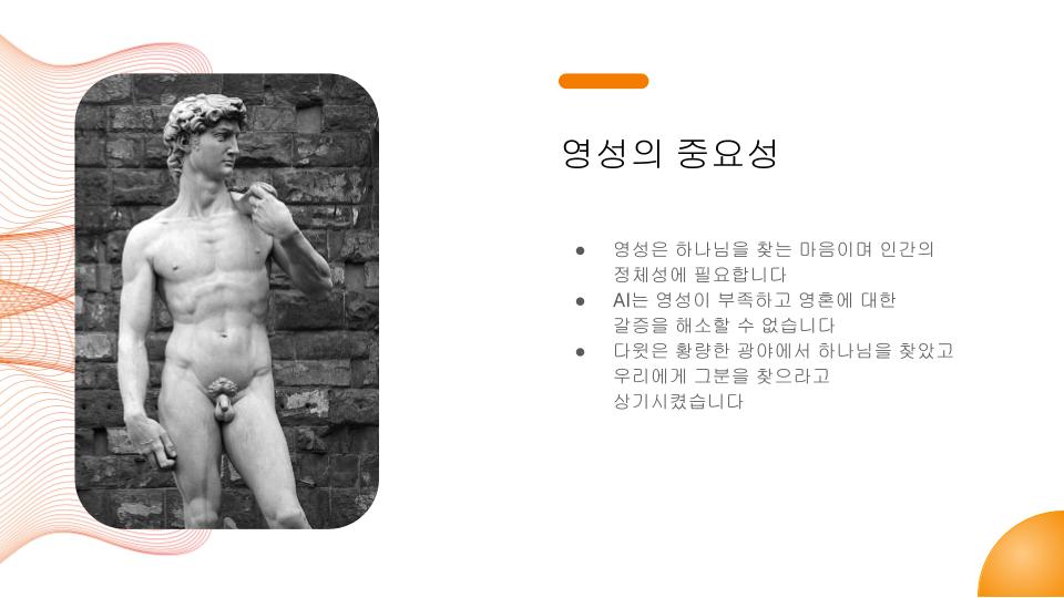 영성이란 무엇입니까? 하나님을 찾는 마음입니다. 인공지능은 하나님을 찾지 않습니다. 인공지능은 영혼의 갈급함이 없습니다. 그러나 하나님의 사람은 영혼이 갈급합니다. 그래서 사슴이 시냇물을 찾기에 갈급함과 같이 하나님을 찾기에 갈급합니다.