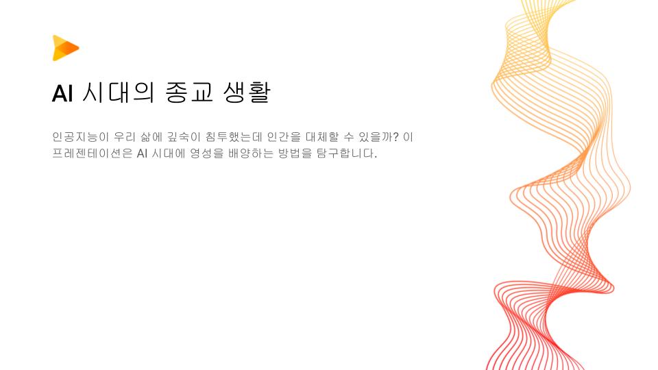 AI 시대의 종교 생활 인공지능이 우리 삶에 깊숙이 침투했는데 인간을 대체할 수 있을까? 이 프레젠테이션은 AI 시대에 영성을 배양하는 방법을 탐구합니다.