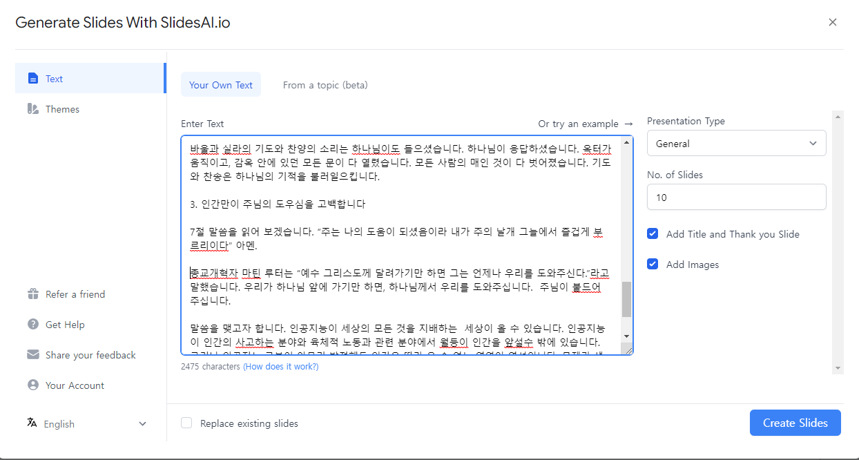 위의 글을 제널레이터 슬라이드 인공지능에 넣어봅니다. (아래참조) 그리고 슬라이드를 생성합니다. 우측하단에 아이콘을 클릭합니다.