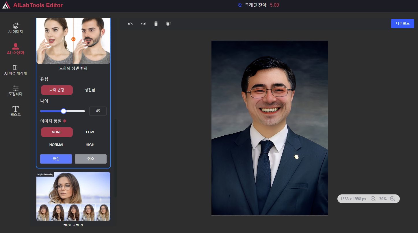 나이를 변경하기 위해 (인공지능 초상화를 클릭 한 후 노화와 성별을 선택하면 사진의 이미지가 변경된다.. 나이는 45세로 변경한 후 이미지 품질은 기본으로 선택합니다.