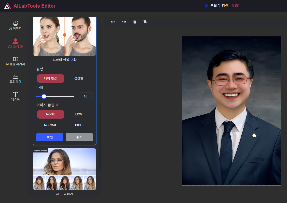 나이를 변경하기 위해 (인공지능 초상화를 클릭 한 후 노화와 성별을 선택하면 사진의 이미지가 변경된다.. 나이는 45세로 변경한 후 이미지 품질은 기본으로 선택합니다.