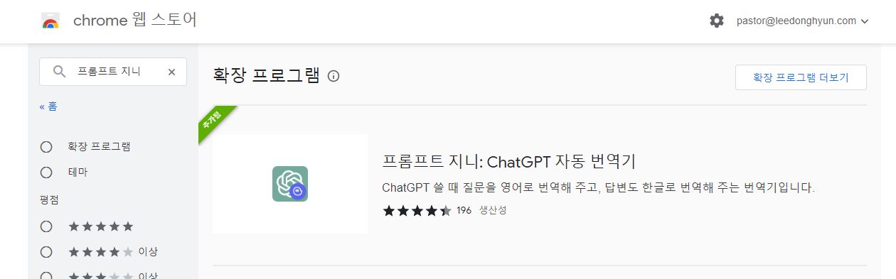 앞서 설명한 것처럼 챗gpt는 한글보다 영어로 작성하는 것이 좋은데 구글번역기로 번역한 후 프롬프트에 입력하기란 여간 번거롭지 않다. 그렇기 때문에 챗gpt에서 자동번역기를 검색한 후 확장프로그램을 설치하면 간편하게 챗봇을 이용할 수 있다. 만약 크롬브라우저에 프롬프트 지니가 설치되어 있지 않다면 크롬브라우저를 실행한 후 크롬 웹스토어에서 프롬프트 지니를 검색한 후 설치한다.
