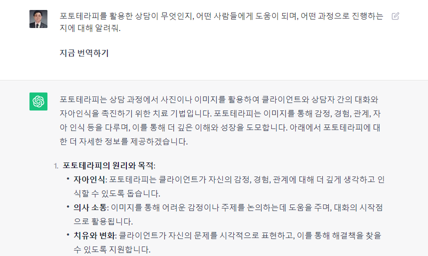 상담자: 안녕하세요! 포토테라피에 대한 이야기를 시작해볼까요? 포토테라피는 이미지와 사진을 사용한 치료 기법으로, 감정과 자아 인식을 향상시키는 데에 도움을 줍니다.