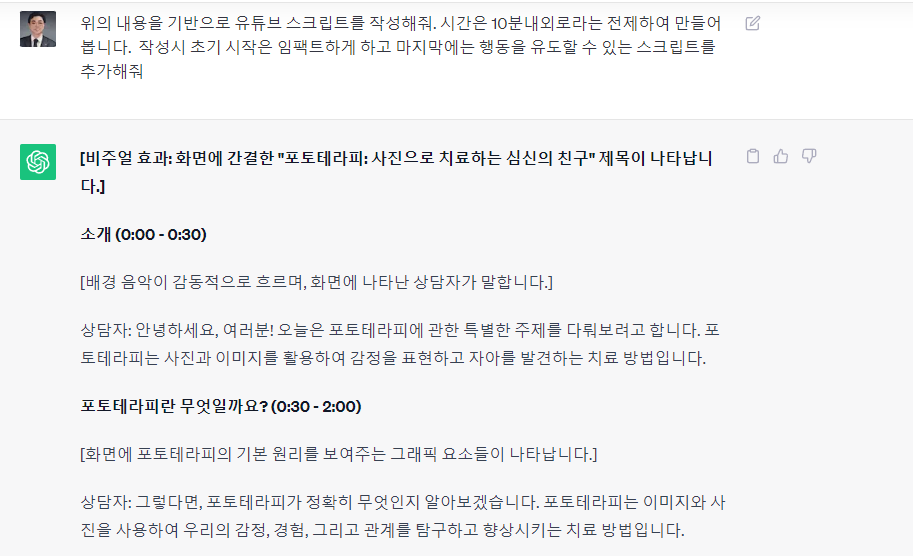 위의 내용을 기반으로 숏폼 스크립트를 작성해보자. 숏폼이란 인스타그램. 틱톡, 숏츠와 같은 짧은 세로 영상을 의미한다. 작성방법은 주제에 대한 내용을 넣고 우너하는 시간 분량이 영상 스크립트를 작성해 달라고 하면 된다. 필자의 경우 방금 작성한 글에 대한 숏폼 스크립트를 작성해 달라고 했다 . 물론 별도로 사진치료에 대한 스크랩트를 작성해줘라고 말해도 되지만 앞서 작성한 글을 기반으로 작성을 요청해 보았다.