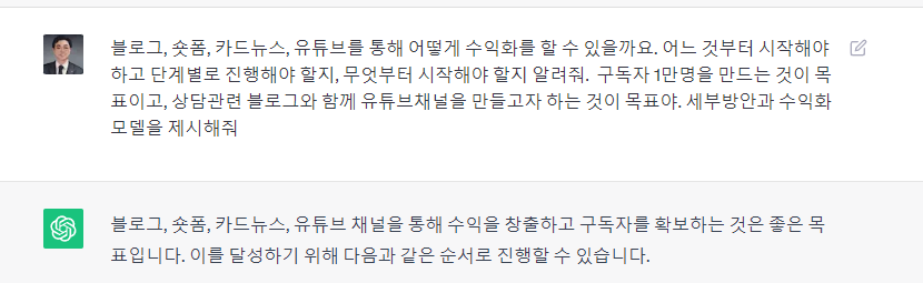 본 콘텐츠는 챗gpt를 활용하여 콘텐츠제작과 수익화모델화 방법에 대해 알려드리고자 작성하였습니다. 명조체로 표기한 내용은 챗gpt가 대답한 내용입니다.