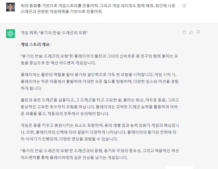 2024년는 용의 해이다. 그래서 용과 관련된 동화를 만들고 싶다면 어떻게 하면 될까? 챗gpt로 자녀나 손주에게 재미있는 용과 관련된 세상에 하나밖에 없는 동화책을 만들어 줄 수 있습니다. 아니면 어릴적에 듣었던 이야기을 가지고 새로운 이야기를 만들어 보세요. 한번만에 좋은 동화책을 만들 수 없겠지만 노력하면 할 수 록 좋은 동화책을 만들 수 있답니다. 한 번 도전해 보시면 어떨까요