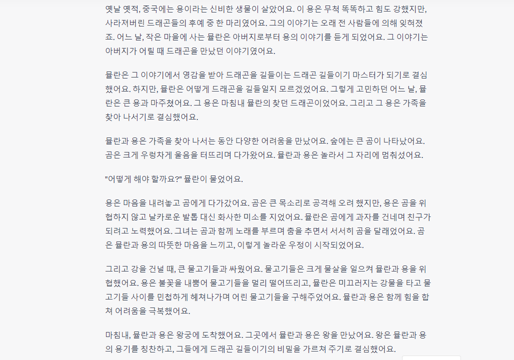 위의 프롬프트로 아래의 동화책 내용을 구성해 보았습니다. 한 번 읽어보세요. 드래곤 길들이기와 뮬란이란 이야기를 기반으로 자신만의 이야기 스토리를 구성할 수 있었습니다. 스토리 구성은 드래곤 길들이기 이지만 주인공은 애니메이션 뮬란을 기반으로 해서요.