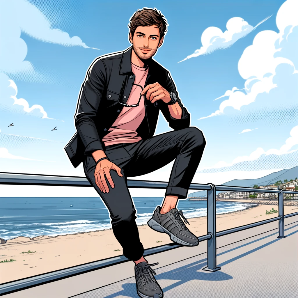 한 남자가 바다와 하늘을 배경으로 한 해안가에 있습니다. 남성용은 검은색 바지와 회색 운동화를 구별하는 역할을 하며, 변형 셔츠 위에 검은색 줄무늬를 입고 있습니다. 그는 철제에 대해 기대하고 있고, 한 손에는 무언가를 쥐고 있습니다. 그의 다리는 많은 문제를 해결하고 있으며, 그는 카메라를 제외하고 포즈를 취하고 있습니다. 사진 남성은 편안하고 기뻐하는 모습을 보일 것입니다. 이러한 상황 아래에서 "바다를 등지고 서 하지만, 미래를 향해 나아갑니다. 항해는 이제부터입니다." 존재하는 주제가 들어갈 수 있는 이미지를 그려줘