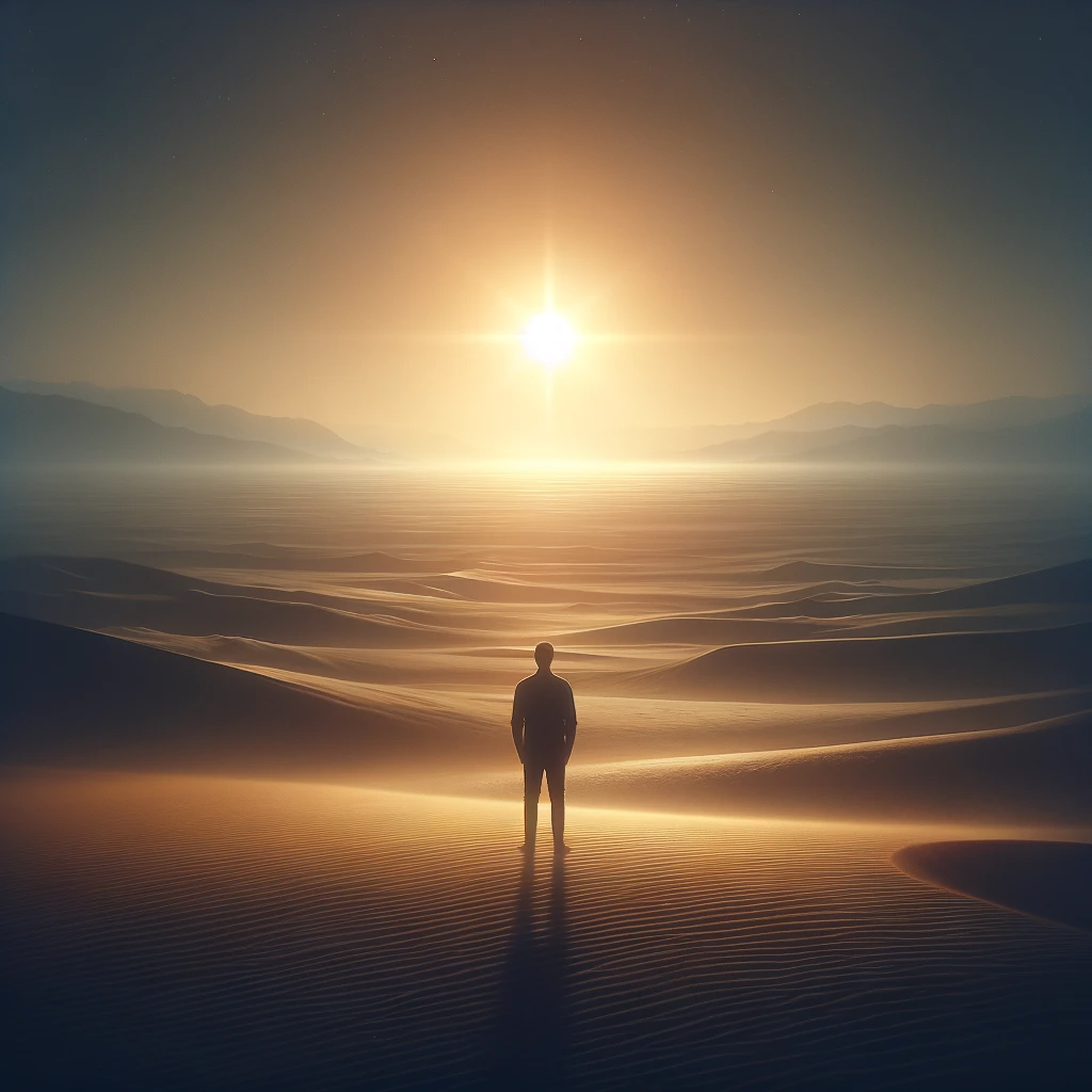 - 이미지: 사람이 광활한 사막에 서 있는 모습. 그가 바라보는 지평선에는 희미하게 보이는 빛이 있어, 희망의 상징처럼 보임.