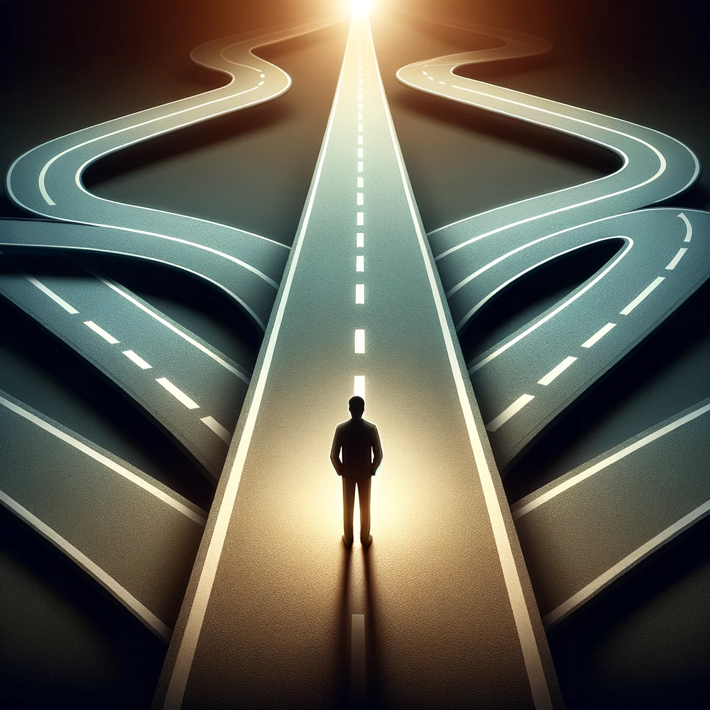 - 이미지: 길을 찾고 있는 사람의 모습, 그 앞에는 여러 갈래의 길이 있으며, 하나는 빛으로 향하는 길로 나타남.