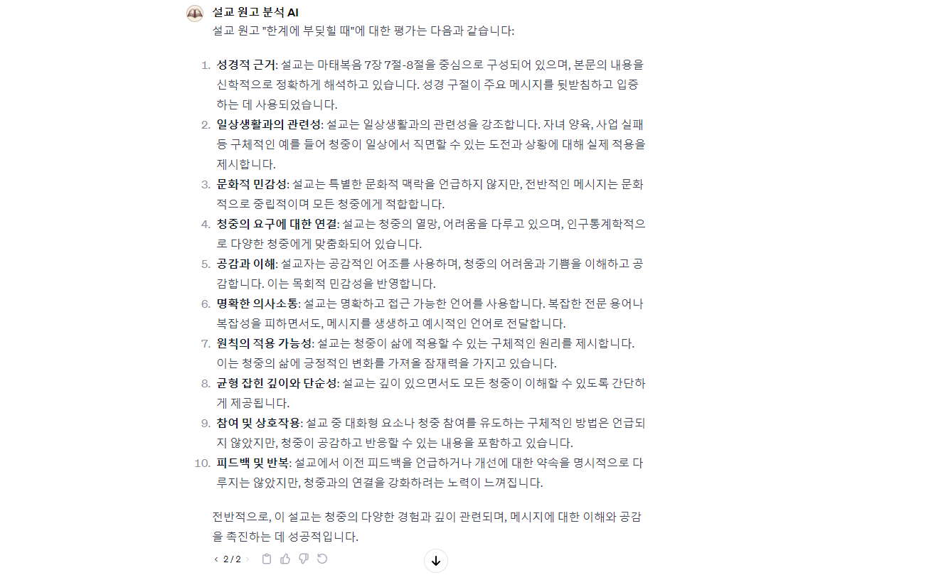 - 피드백 및 반복: 설교에서 이전 피드백을 언급하거나 개선에 대한 약속을 명시적으로 다루지는 않았지만, 청중과의 연결을 강화하려는 노력이 느껴집니다.