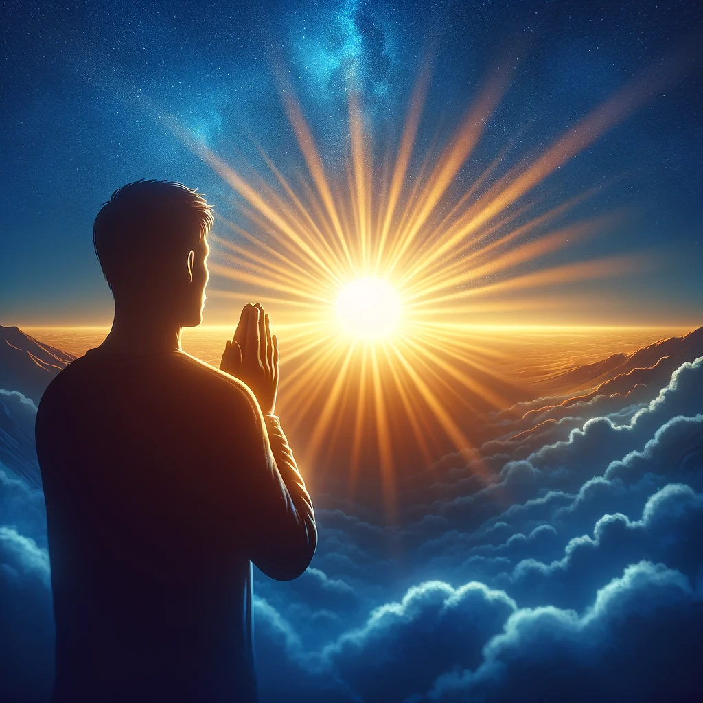- 이미지: 사람이 두 손을 모아 기도하는 모습, 그의 뒤로는 태양이 떠오르는 장면이 보임.