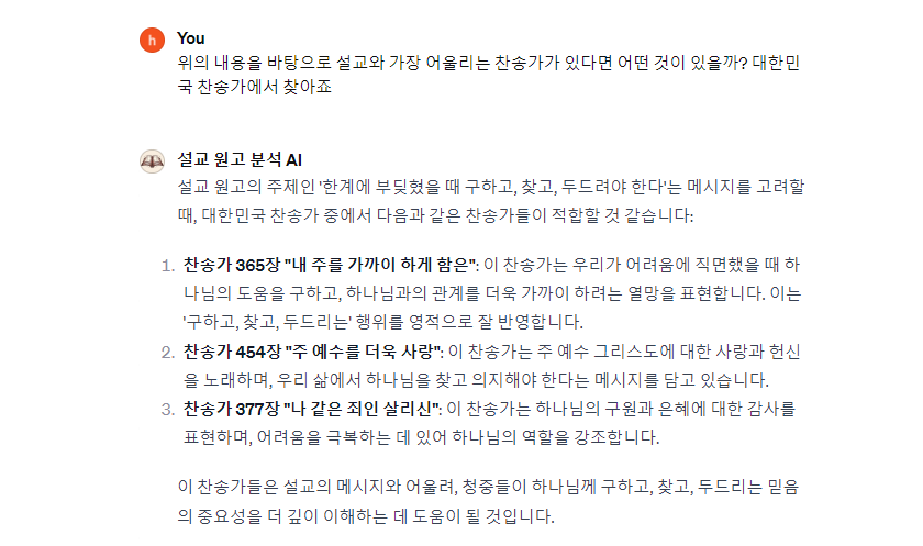 여러분들이 보시기에는 어떠한가요. 설교원고뿐만 아니라 예배에 가장 잘 어울리는 찬양을 선별해 줌으로서 설교준비에도 도움이 된다는 사실에 다시금 놀라게 되지 않나요. 물론 인공지능에게만 설교를 맡겨서는 안됩니다. 기도해야 합니다. 말씀을 더 깊이 묵상해야 합니다.